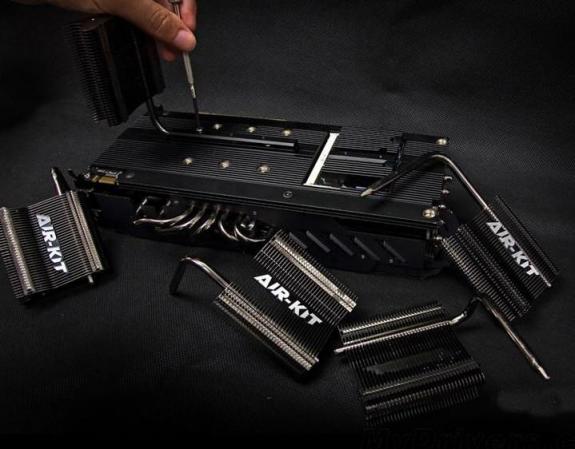 Новинка построена на основе нереференсной печатной платы черного цвета, практически полностью переработанной китайскими специалистами. Кастомайзингу подверглась подсистема питания (здесь она 8-фазная, при этом предусмотрена возможность сделать ее 12-фазной), а оригинальная трехслотовая система охлаждения производит невероятное впечатление. В конструкцию кулера входит три вентилятора (90 мм, 2х 80 мм), массивный алюминиевый радиатор, охлаждающая платина и десять медных тепловых трубок. Но и это еще не все, ведь разработчик позволит вам установить дополнительно еще пять теплосъемников Turbo-Kit.
