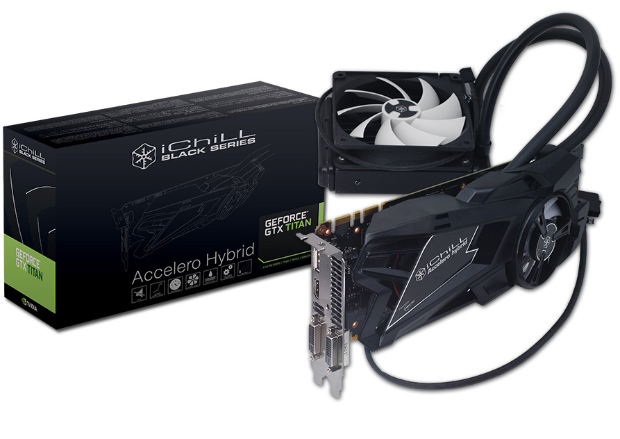 Так, компания Inno3D отметилась в эти дни запуском модели под маркетинговым названием Inno3D GeForce GTX Titan iChill Black Series, в состав которой входит гибридная система охлаждения Arctic Accelero Hybrid, установленная на печатной плате эталонного дизайна. Напомним, предусмотренный здесь кулер сочетает в себе замкнутый водоблок, в зону влияния которого попадает графический чип, а также вентилятор с радиатором, которые занимаются обеспечением оптимального температурного режима микросхем памяти и подсистемы питания.