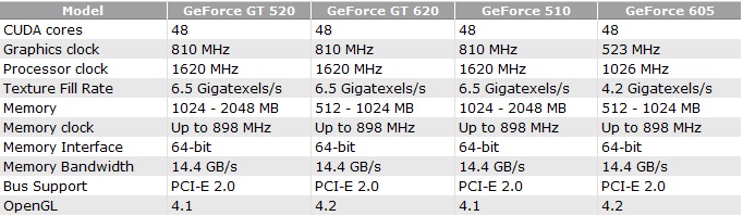 Карта GeForce GT 620, как и GeForce GT 520, наделена 48 потоковыми CUDA-процессорами, тактовая частота ядра и шейдерного домена равна 810 МГц и 1620 МГц соответственно. 512 или 1024 МБ видеопамяти DDR3 с 64-битной шиной характеризуются скоростью 898 МГц. Модель GeForce GT 605 практически один в один повторяет спецификации GT 620, правда здесь частота GPU и потоковых процессоров равна 523 МГц и 1026 МГц соответственно.