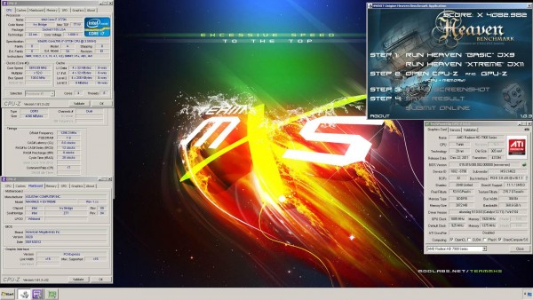 И вот очередной мастер-класс от mtech: приложение то же – Unigine Heaven Extreme (DX11), адаптер такой же – Radeon HD 7970, но один, и перед нами результат в 4082,98 DX11 Marks, который выводит нашего коллегу на первую строчку как в глобальном рейтинге для однокарточных систем (первый из тысячи результатов J), так и в дисциплине среди всех ускорителей модели Radeon HD 7970. На тестовом стенде mtech использовал процессор Intel Core i7 3770K, разогнанный до 5,616 ГГц и охлаждаемый «каскадом», а также материнскую плату ASUS Maximus V Extreme (Intel Z77). Что касается подопытной видеокарты, то энтузиаст задействовал сэмпл производства MSI, применив для охлаждения критических элементов колбу с жидким азотом. Со стоковой частотной формулы 925/5500 МГц (ядро/память) ускоритель был разогнан до уровня 1685/7680 МГц.