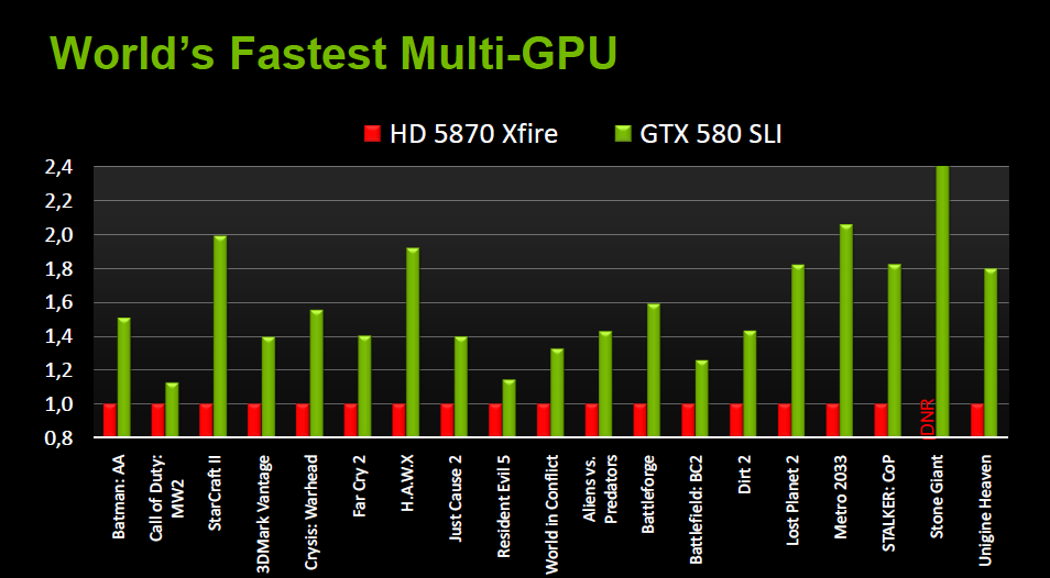 Кроме того, виртуальная двухчиповая GTX 580 X2, полученная как SLI из GeForce GTX 580 становится судя по графикам лидером и среди Multi-GPU систем, одержав победу над CrossFire–тандемом из Radeon HD 5870 порой с неприличным отрывом: