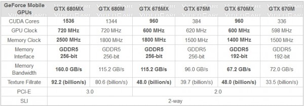 Вот и на этот раз компания NVIDIA без особой шумихи запустила новых представителей мобильного семейства адаптеров GeForce GTX 600 28-нанометрового поколения Kepler. Ранее анонсированный флагманский акселератор GeForce GTX 680M был сменен моделью GTX 680MX, кроме этого в ассортимент были добавлены модели GTX 675MX и GTX 670MX. Представленные видеокарты в сравнении с моделями с приставкой «M» могут похвастаться увеличенным количеством потоковых CUDA-процессоров. Так, карта GTX 680MX теперь располагает 1536 CUDA-ядрами, как и ее декстопный собрат GTX 680, адаптеры GTX 675MX и GTX670MX получили в два с половиной раза больше шейдерных блоков, чем имеется у GTX 670M – здесь их 960 штук. GTX 680MX и GTX675MX используют память типа GDDR5 с 256-битным интерфейсом, для GTX 670MX предусмотрена 192-битная шина (как в GTX670M).