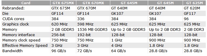 GeForce GT 645M будет предлагаться в двух вариантах: с памятью DDR3 или GDDR5, также как и представленная ранее карта GT 640M. Карта использует ядро GK107 GS, получила 384 потоковых процессора, 32 TMU и 16 ROP, для DDR3-версии частота памяти установлена на отметке 1800 МГц, модель с GDDR5 характеризуется частотой 4 ГГц. Шина памяти для обеих версий 128-битная.