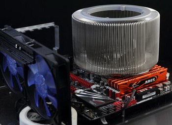 Не секрет, что высокая эффективность работы NOFAN CR-95С достигается за счет огромного радиатора. Оверклокеры решили проверить, а будет ли достаточно такого решения для полноценного отвода тепла с разогнанного процессора с установленным на CR-95С тихоходным вентилятором. Итак, после установки под испытуемый алюминиевый охладитель чипа Core i7-2600K (Sandy Bridge), были сняты показания температуры в стандартном (3,4 ГГц) и разогнанном состоянии (4,4 ГГц, 1,275 В) при установленном дополнительном охлаждении и без него.