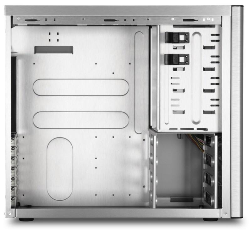 Линейные размеры Sharkoon AL4 составляют 480 (Д) х 192 (Ш) х 430 (В) мм, здесь комфортно может разместиться «материнки» формата ATX. На передней панели такого корпуса нашлось место для четырех 5,25-отсеков, а приобрести его можно будет по цене €49.