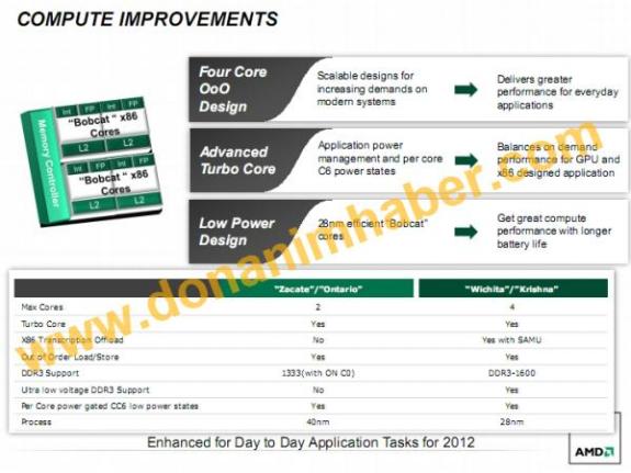 Новинки являются частью платформы Deccan, которая использует новый сокет FT2 (у Zacate и Ontario – FT1) и по данным производителя обеспечат на 20% больше вычислительной мощи и на 25% увеличат КПД графической подсистемы в сравнении с предшественниками. Данные чипы используют 22-нанометровый техпроцесс, имеют 2 МБ кэша L2, поддерживают функцию Turbo Core и оперативную память DDR3-1600 (включая low-voltage-планки).