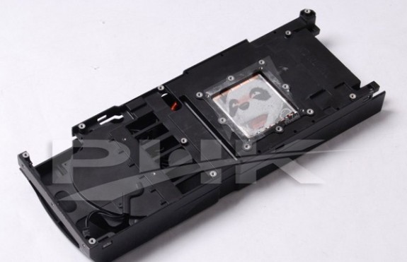 Теперь же нашему вниманию представлены снимки системы охлаждения видеокарты в разборе, так что у нас есть прекрасная возможность посмотреть, что же скрывается внутри этого охладителя. Кулер, как уже говорилось ранее, занимает два слота расширения «материнки», и накрывает всю лицевую сторону печатной платы. Он состоит из одного вентилятора турбинного типа, алюминиевого радиатора и пяти медных тепловых трубок, предположительно диаметром 8 мм или больше, которые находятся в непосредственном контакте с графическим процессором. Остальные характеристики пока что скрыты от наших глаз.