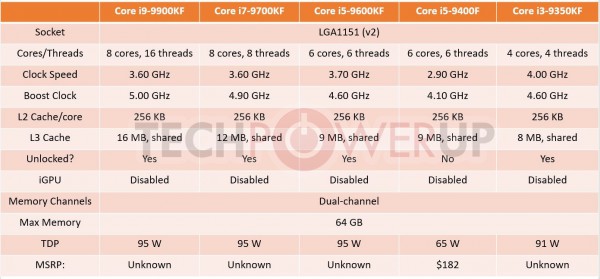 Среди новинок замечены Core i9-9900KF, Core i7-9700KF, Core i5-9600KF, которые имеют такие же тактовые частоты, как и десктопные собраться i9-9900K, i7-9700K, i5-9600K, соответственно. Также в списке можно обнаружить чип начального уровня Core i3-9350KF с четырьмя ядрами и четырьмя потоками, который имеет частотную формулу 4,0/4,6 МГц и получил 8 Мбайт кэша L3.