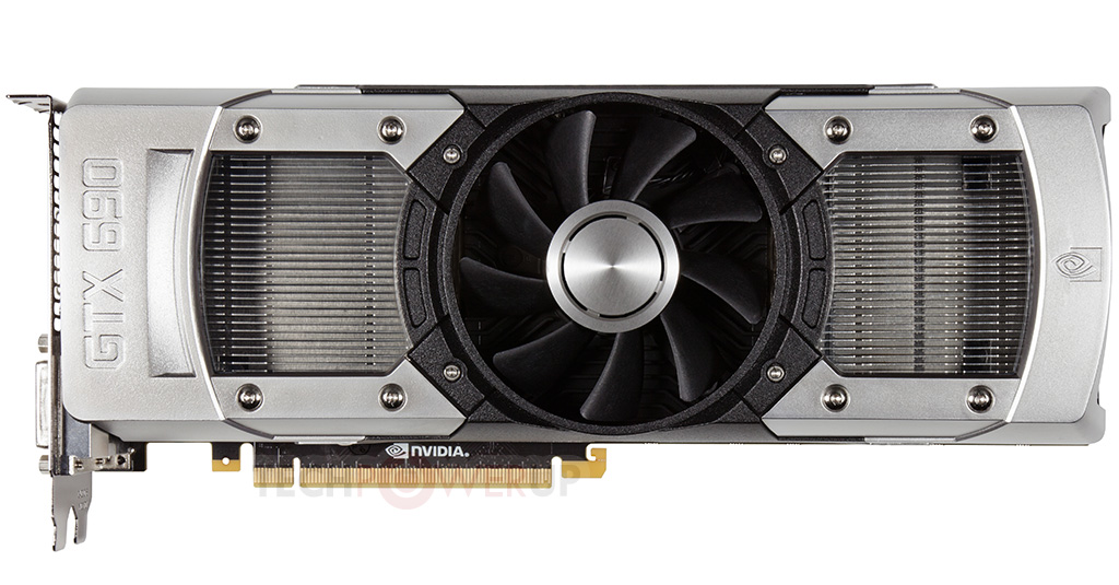 Согласно полученным данным, GTX 690 получил 3072 потоковых CUDA-процессоров, объем набортной видеопамяти GDDR5 составляет 4096 МБ, она соединяется с GPU по 512-битной шине. Внешне новинка больше напоминает разработку сторонних вендоров, поскольку на смену привычному черному пластиковому кожуху системы охлаждения пришел металлический, который также выполняет теплорассеивающую функцию. Корпус кулера изготовлен из магниевого сплава, под ним скрывается две испарительные камеры и никелированный алюминиевый радиатор крупных размеров. Печатная плата видеокарты получила двойной слой напыления меди, разводка подсистемы питания выполнена по 10-фазной схеме.