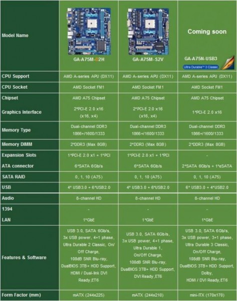 Совместимые с серией APU A-Series на сокете FM1, свежие модели получили дизайн Ultra Durable 1/2/3, два/четыре слота для оперативной памяти DDR3-1866+, от одного до трех (GA-A75-UD4H) разъемов PCI-Express x16, порты USB 3.0 (максимум 8) и SATA 6 Гбит/с, а также 7.1-канальный звук. Представители серии Gigabyte A75 несут в себе гигабитную Ethernet-сеть, DualBIOS, USB Power Boost Technology (больше мощности через разъем USB) и, в зависимости от модели, могут содержать порты e-SATA и FireWire.