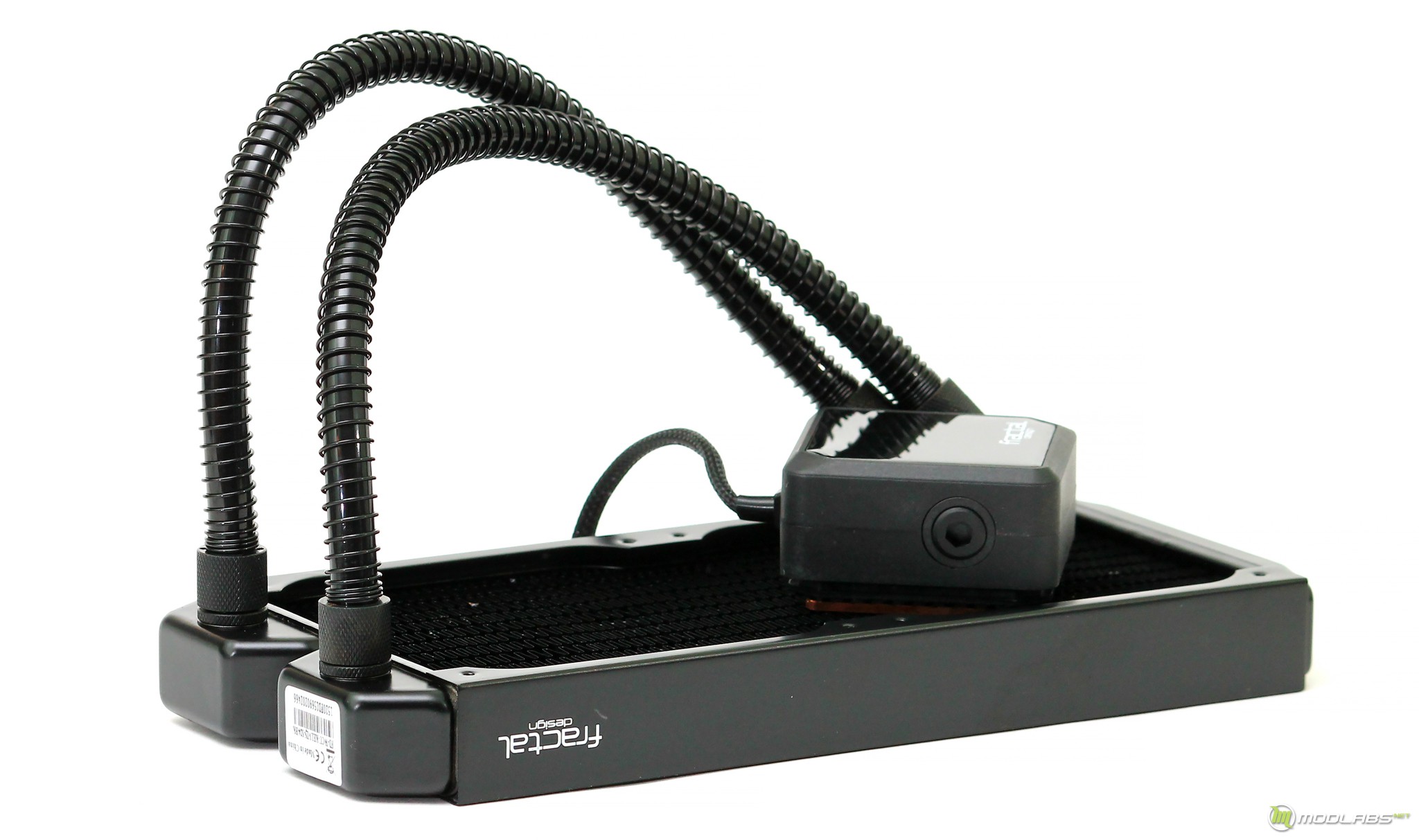Алюминиевые радиаторы соединены с насосом с помощью 400-мм трубок в нейлоновой оплетке и имеют размеры 284 х 122 х 31 мм (Celsius S24) и 403 х 123 х 30 мм (Celsius S36). В зависимости от модели здесь устанавливается два или три фирменных 120-мм вентилятора Fractal Design Dynamic X2 GP-12 PWM на подшипниках LLS с переменной скоростью от 500 до 2000 об/мин. Пропеллеры имеют звуковое давление на уровне 32,2 дБА, создают воздушный поток до 87,6 CFM и подключаются к специальному хабу на радиаторе.
