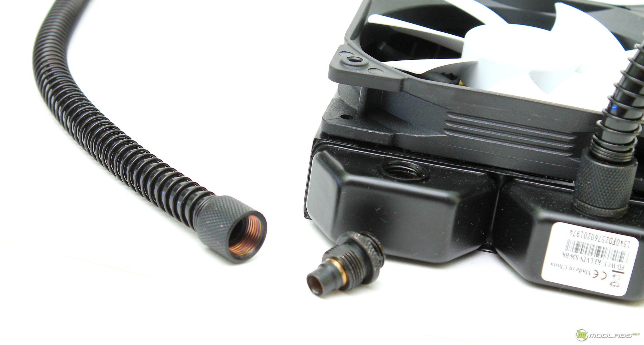 Первое, что наблюдается в районе фитингов, так это весьма добротные области расширения радиаторов. Они позволяют содержать внутри контура больше жидкости. Далее можно отметить наличие двух фитингов с обычным водяночным строением, они имеют накидную головку для фиксации шланга и классическую посадку с резьбой 1/4″.