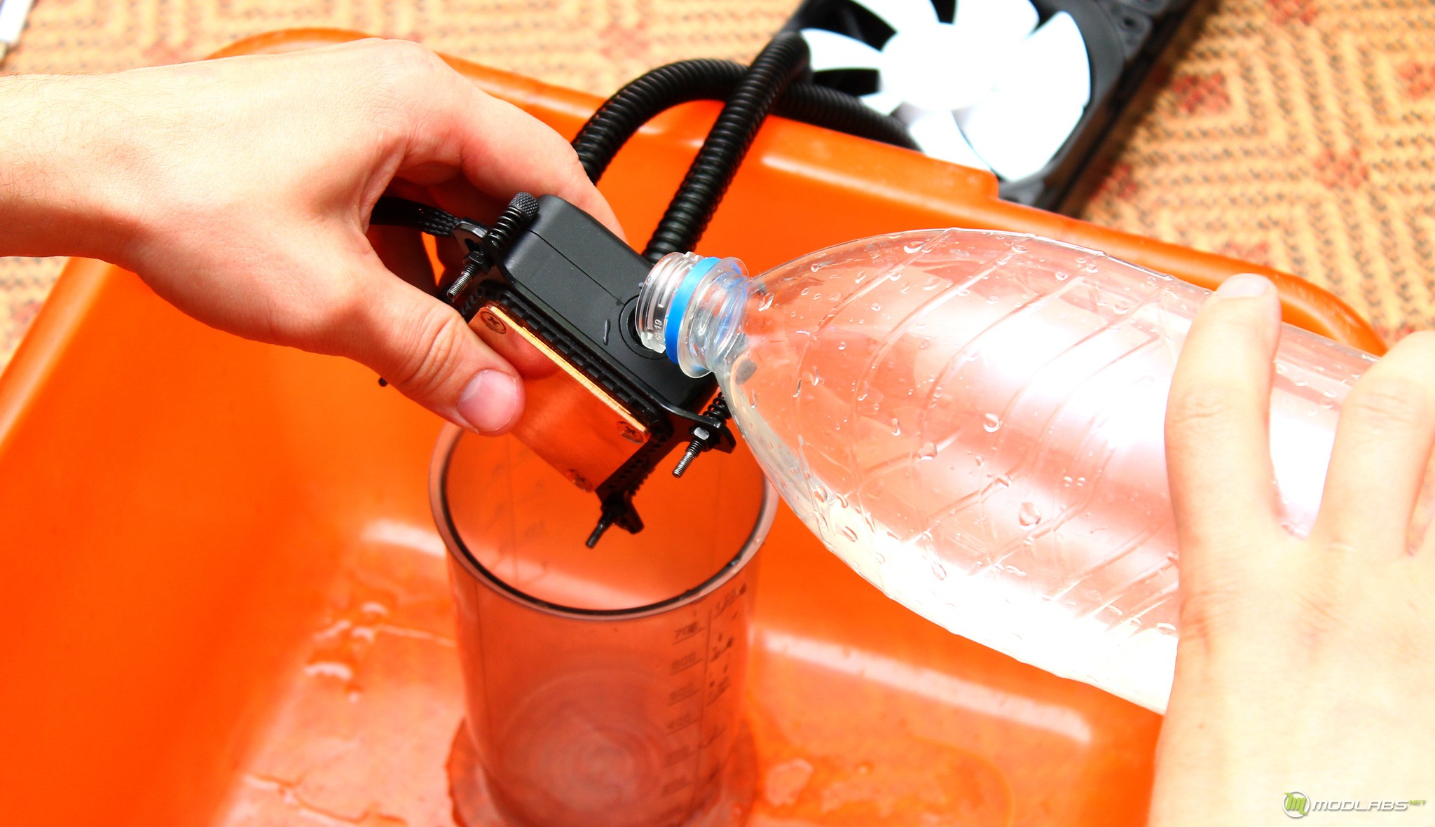 После подгона шлангов и их соединений, можно аналогично разбору быстро заправить основной объем жидкости через радиатор. При этом нужно учитывать, что из противоположного фитинга (на фото он на видеокарте) в любой момент может политься вода.