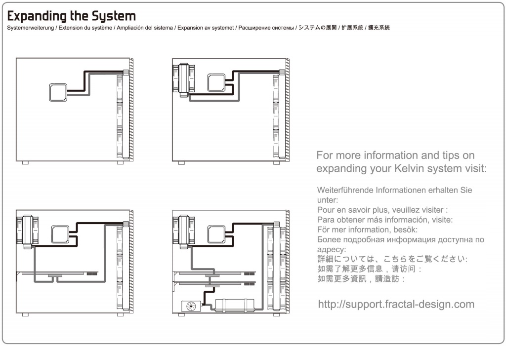 Pre-filled CPU Water Cooling System – именно такой «ярлык» Fractal Design приписали к своей линейке систем водяного охлаждения KELVIN. В ней есть три решения KELVIN T12, S24 и S36. Весьма стандартно, но вариации различаются только размером используемого радиатора. Вернемся к ярлычку на коробке, по заявлению производителя система готова включить в свой контур дополнительный радиатор или ватерблок видеокарты, а то и обоих сразу.