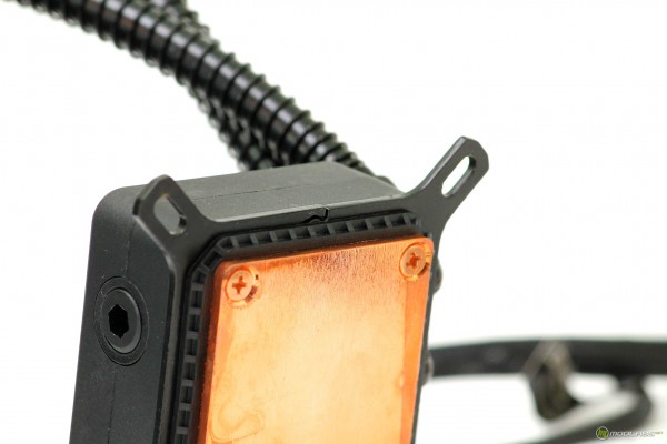 Блок помпы в целом достаточно стандартный и не отличается явными визуальными изысками. По бокам применяется матовый пластик, верхняя крышка располагает логотипом производителя и выполнена из глянца. Она, признать честно, очень хорошо собирает отпечатки пальцев и небольшие пылинки. Согласно спецификации производителя, помпа может прокачивать до 72 литров в час, а максимальный уровнем подъема находится на отметке одного метра, что не столь весомо для полноразмерных аналогов, но значительно для AIO-сегмента.