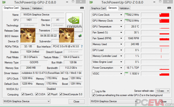 Итак, модель NVIDIA GeForce GTX 960, как было сказано ранее, базируется на 28-нанометровом ядре GM206 поколения Maxwell, в котором, по последним данным, активными являются 1024 потоковых CUDA-процессора и 32 растровых блока. Это вполовину меньше, чем несет в себе топовый одноядерник GTX 980. Показанные в GPU-Z тактовые частоты 1228/1291 МГц вряд ли будут справедливы для рефересной модели, так что, для того, чтобы узнать эти показатели, придется дождаться официальных данных.