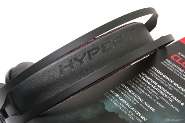 На внешней части кожаного оголовья расположена надпись HyperX, которую видно через черные дуги металлической рамы.