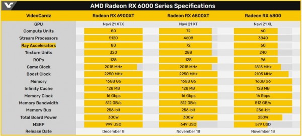 Из подробных спецификаций на сайте AMD мы узнаем, что эта модель имеет 80 так называемых «ускорителей лучей» (Ray Accelerator), 320 TMU и 128 ROP. AMD объявила, что Radeon RX 6900XT поступит в продажу 8 декабря. Карта будет стоить 999 долларов США.
