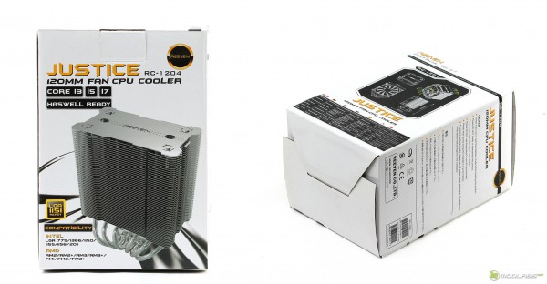 Reeven Hans RC-1205 прибыл к нам в небольшой картонной упаковке. На ее сторонах есть хорошо отраженное название модели, фотография, перечень поддерживаемых сокетов и небольшой список характеристик. Даже блок схема с размерами в наличии. В общем, с информативностью все в полном порядке.