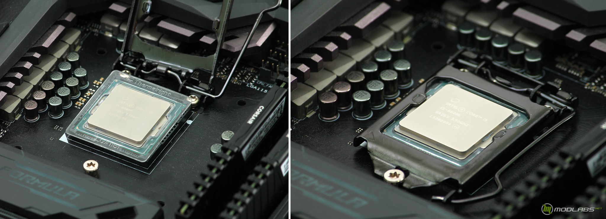 Установка процессора с этой «проставкой» не вызвала затруднений. Но забегая вперед скажу, что ее наличие ухудшило качество прижима и явно повысило температуры процессора. Я не стал долго разбираться и попросту убрал ее и продолжил тесты. Возможно, каким-то образом на нее повлиял процесс скальпирования процессора – лишние бугорки силикона и тд. Если ваш процессор не скальпирован и находится в стоковом состоянии, отпишите о результатах ее установки в комментариях ;).