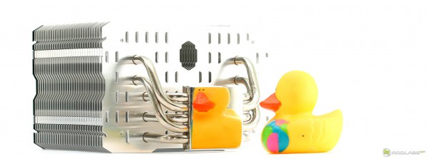 В конструкции рассеивающего блока заложено 53 рассеивающие пластины. Они увеличены в размерах, но также имеют небольшое утопление в центральной части. Для отвода тепла от основания есть шесть тепловых трубок, что на две больше чем Hans’a. В отличии от большинства решений тепловые трубки выходят из основания в плоскости параллельной радиатору. Что в первую очередь потребовало их очень хорошо изогнуть в области основания. А вот во вторую, позволило очень равномерно распределить их по площади всех рассеивающих пластин.