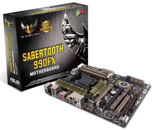 Плата ASUS Sabertooth 990FX для CPU AMD Zambezi позирует перед камерами